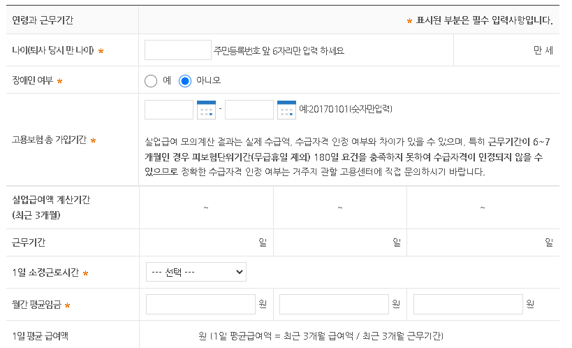 해당 칸을 채우시면 실업급여 모의계산 급여가 나옵니다.