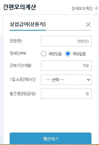 좀 더 자세히 기입하고 상세하게 모의 계산을 할 수 있습니다. 고용보험 홈페이지에는 상세 모의계산, 간편 모의계산을 하실 수 있네요.