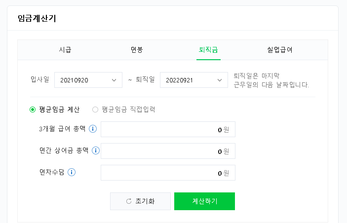 정리하면 입사 일자, 퇴직 일자(퇴사 일자는 반드시 퇴사한 다음날로 입력하기), 퇴직 전 3개월 기간 동안의 기본급, 기타 수당, 연간 상여금 총액, 연차수당을 알고 계시면 나머지는 자동으로 계산이 됩니다.