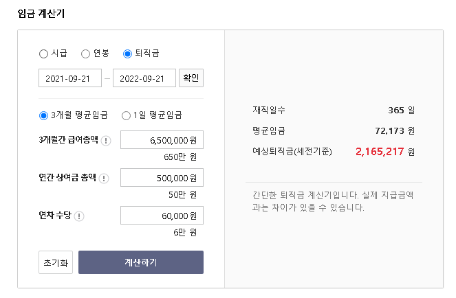 회사의 임금체계에 따라 실제 지급금액과 다를 수 있으니 퇴직금 계산기는 모의 계산용으로 사용하시면 좋을 것 같습니다.