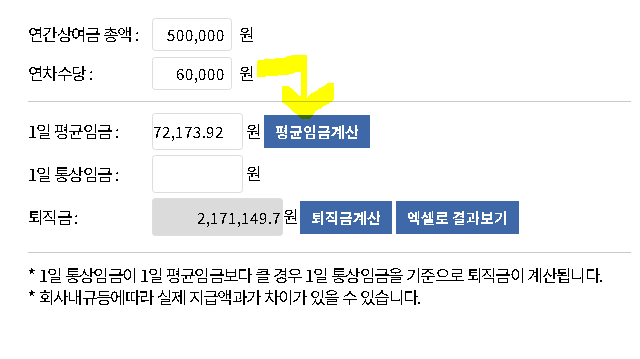 이렇게 입력하고 파란 박스의 '평균임금계산'을 클릭하면 자동으로 '1일 평균임금'액이 나옵니다.