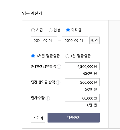 위의 고용노동부 퇴직금 계산기의 금액을 입력해보았습니다.