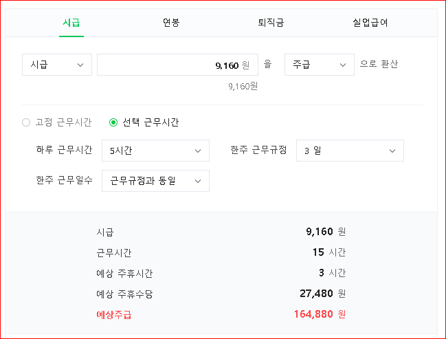 시급 9,160원, 하루 근무시간 5시간, 한주 근무규정 3일을 입력하고 계산하기를 클릭해보았습니다.