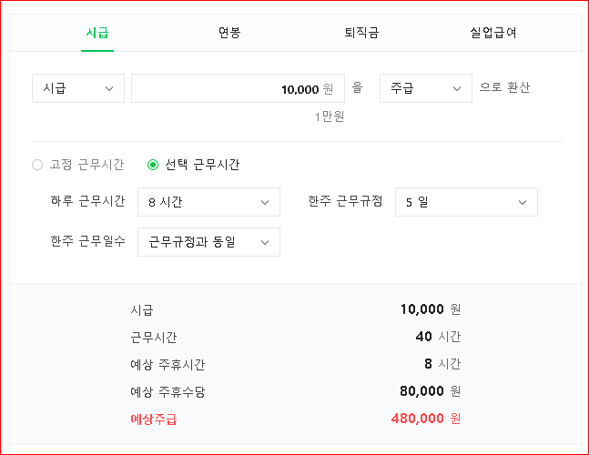 위의 첫 번째 예시와 같이 시급을 10,000원 입력하고, '선택 근무시간'을 선택하였습니다.
