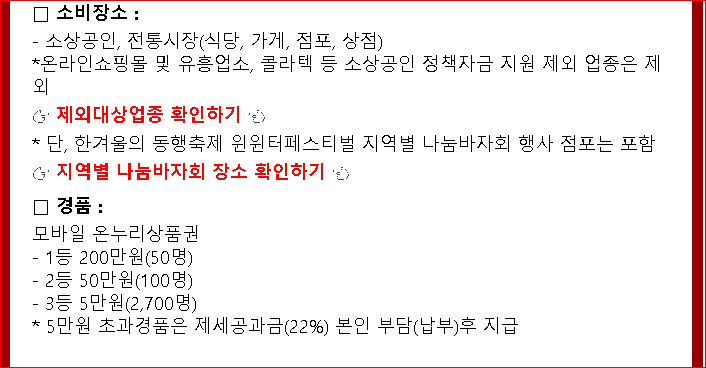 - 온라인 가맹점 구매 영수증, 법인카드 영수증, 가맹점용 카드 영수증, 지출증빙용 현금영수증, 카드형 온누리상품권 영수증, 지류형 온누리상품권 영수증은 응모불가입니다.