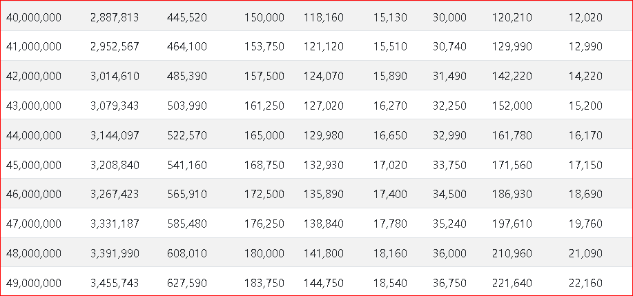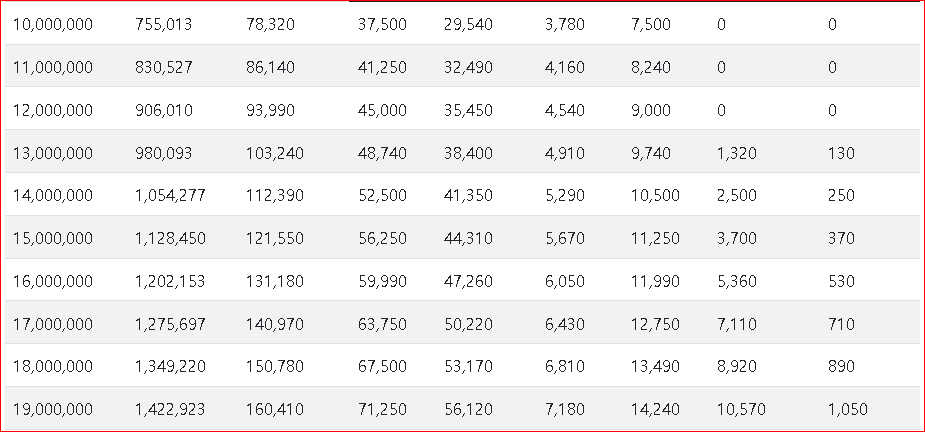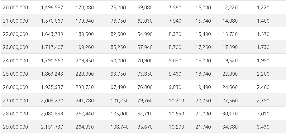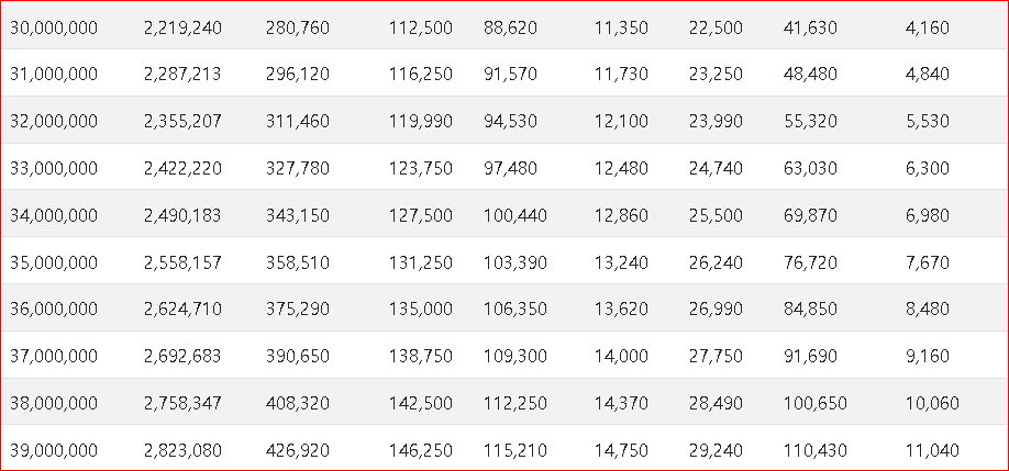 먼저 2023년 연봉 실수령액표입니다. 표의 순서는 연봉, 실수령액, 공제합계, 국민연금, 건강보험, 장기요양, 고용보험, 소득세, 지방소득세 순입니다.