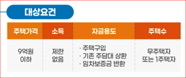 º 주택보유수는부부합산 무주택자(구입용도)이거나, 1주택자(상환, 보전용도)가 신청가능합니다. (분양권이나 입주권도 주택보유에 포함되며, 1 주택자의 경우 2년 내 처분조건이 들어가게 됩니다.)