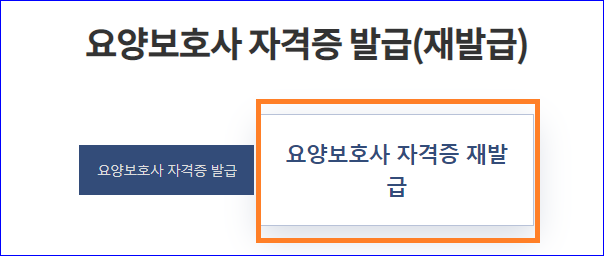 요양보호사 자격증 발급(재발급) 페이지가 뜹니다. 아래와 같이 '요양보호사 자격증 재발급'을 클릭해 줍니다.