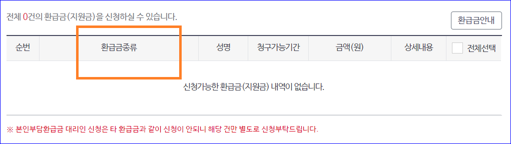 저의 경우 아래와 같이 '신청가능한 환급금(지원금) 내역이 없습니다.'라고 나왔습니다.